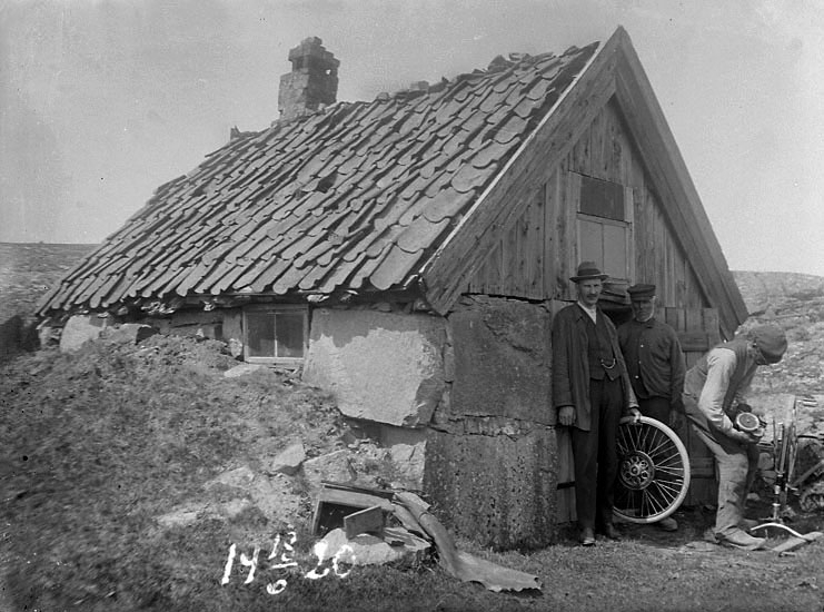 Enligt noteringar: "Cykelreparation vid smedjan på Skistad. I dörren far och son, Johannes