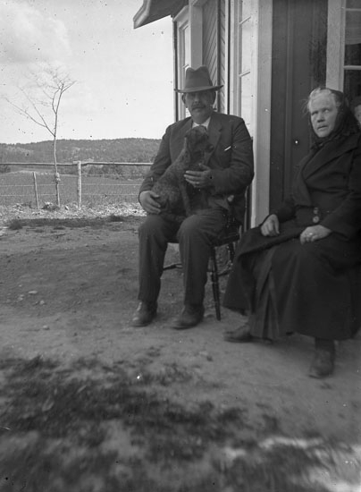 Enligt notering: "Man, kvinna och hund, Karl Karlsson, Kristina f. Hedlund från Salhem Ulvesked".