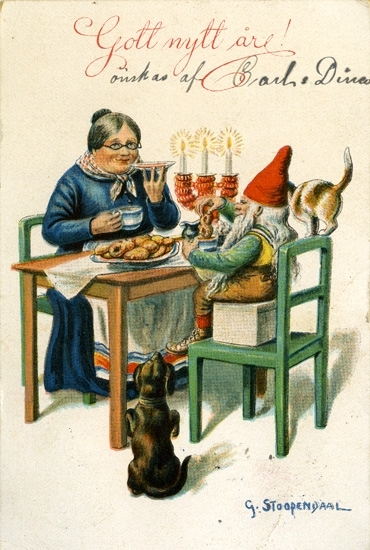 Kort: "Gott nytt år". Husmor och tomte dricker kaffe vid köksbordet.