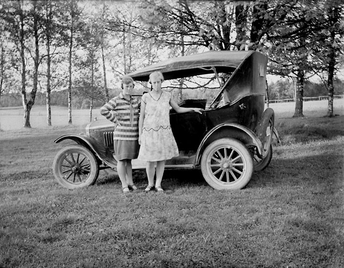Svea Lund och Hulda Juliusson, Hedekas, framför en bil