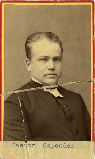 Text på kortets baksida: "Pastor Gottfrid Cajander. Pastor Cajander kom. i Lane-Ryr. Kyrkoherde i Foss, f. 1851. Huvudman i U-a Sparbank 1893-96. Stadsfullmäktiges ordförande 1893-94".