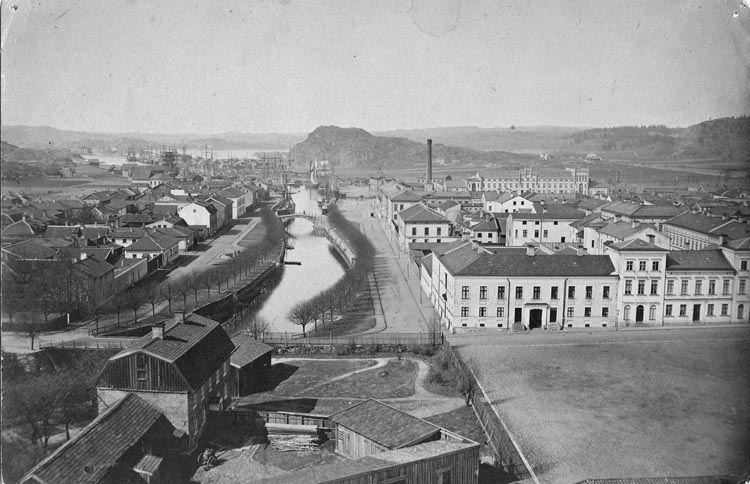 "Karl XII:s huset till vänster, Norra o Södra Hamngatan västerut från torget. 1885.
