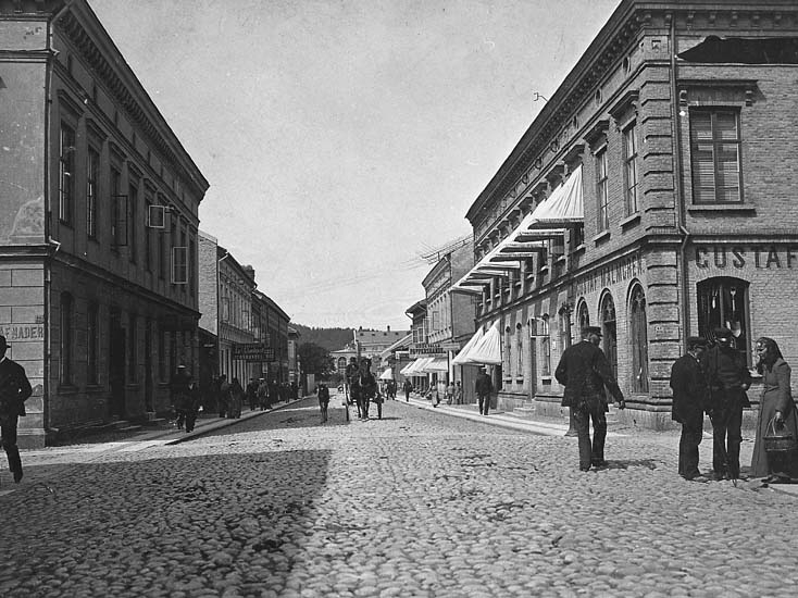 Enligt noteringpå fotot: "Kungsgatan Uddevalla. Taget före 1894. Svensson konditori flyttade 1894 till sin nya lokal detta år. Hade t.o.m. 1893 lokal där biografen Aveny nu ligger. Konditoriets skylt syns bakom Lundqvists järnhandels skylt".