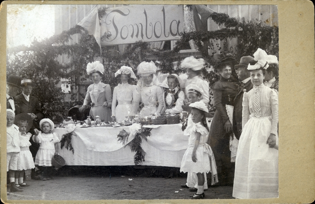 Försäljning av lotter. Runt ett bord står fem kvinnor, varav en iklädd folkdräkt(troligen skånsk) övriga har moderiktiga klänningar och hatt. Runt bordet rör sig kvinnor, män och barn. Bordet och väggen bakom är utsmyckade med ormbunksblad och girlanger och över det står "Tombola" på en skylt
