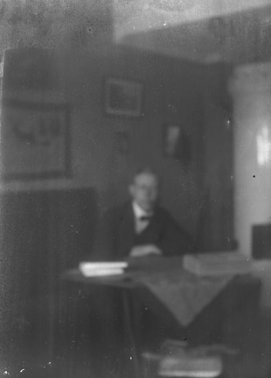Enl. text i blå bok: "Interiör, man vid bord."