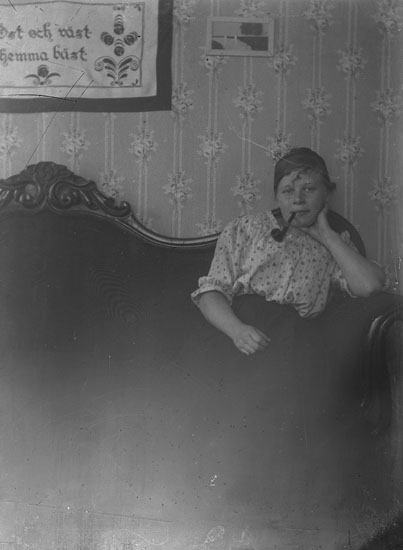 Enl. text i blå bok: "Dam med pipa i soffhörn."