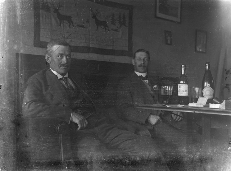 Enl. text i blå bok: "Interiör, två män i soffa."