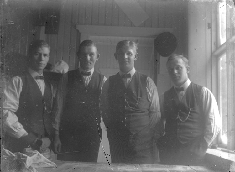 Enl. text i blå bok: "Interiör, fyra män. Konfektionsfabrik."