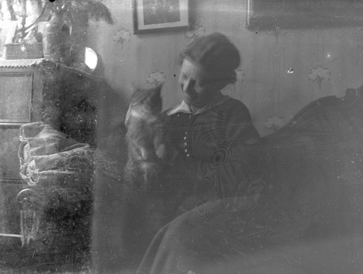Enl. text i blå bok: "Interiör, dam med katt."
