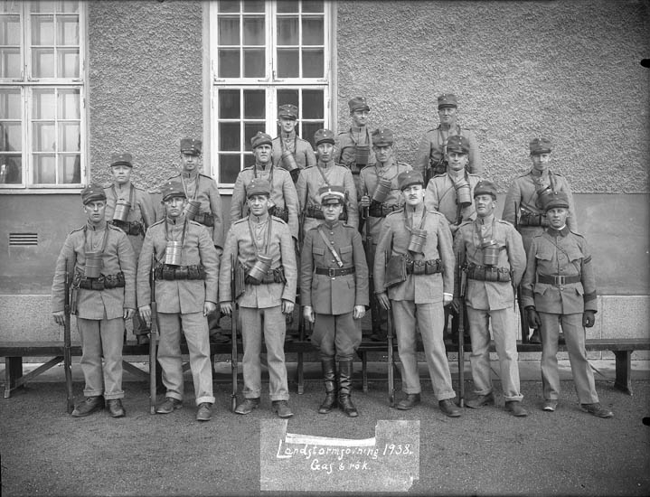 Text till bilden:"Landstormsövning 1938. Gas och rök gruppen".
