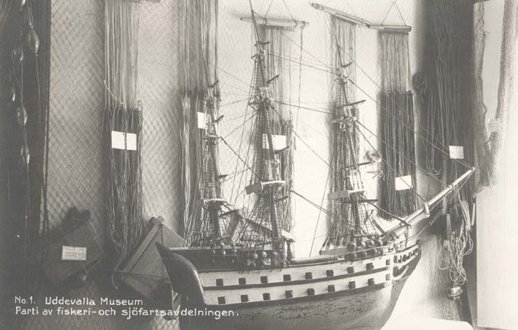 Tryckt text på kortet: "No 1. Uddevalla Museum. Parti av fiskeri- och sjöfartsavdelningen. Se föremålsdatabasen UM1069, Modell örlogsfartyg 1700-tal.