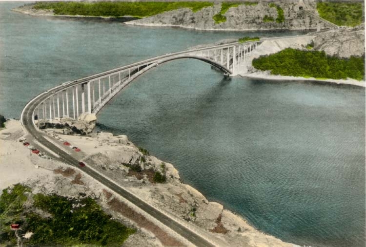 Tryckt text på kortet: "Tjörnbroarna över Askeröfjorden och Källösund. Flygfoto."
