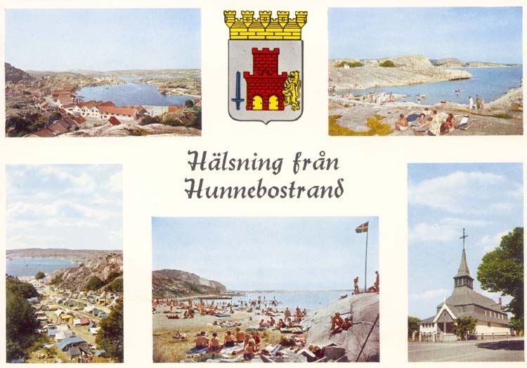 Tryckt text på kortet: "Hälsning från Hunnebostrand."