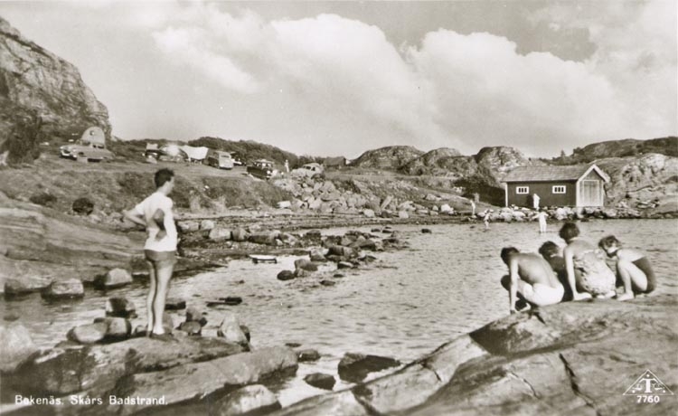 Tryckt text på kortet: "Bokenäs. Skårs Badstrand.".