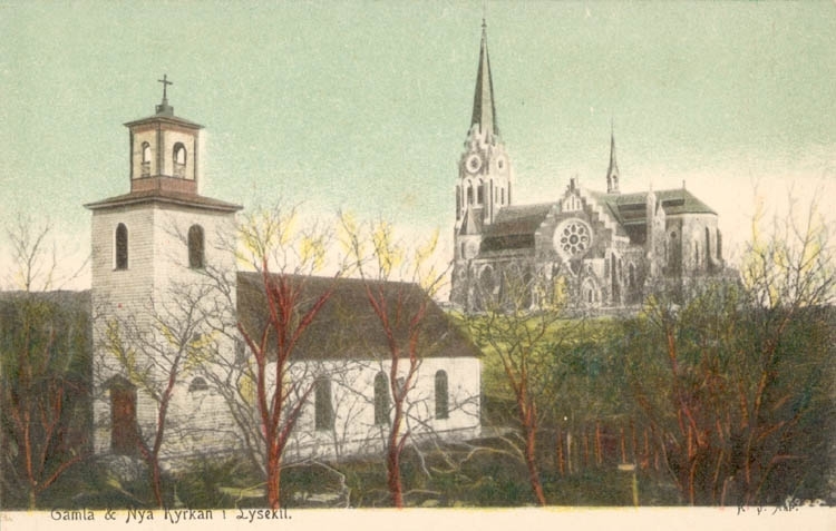 Tryckt text på kortet: "Gamla & Nya Kyrkan i Lysekil".