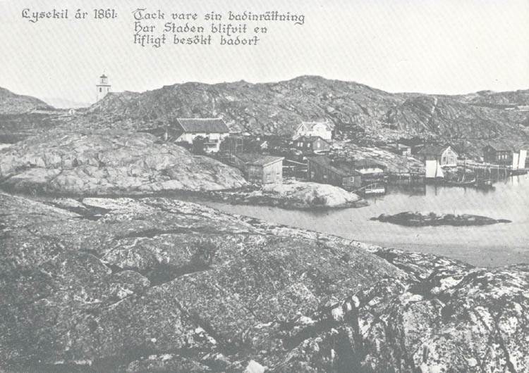 Tryckt text på kortet: "Lysekil år 1861: Tack vare sin badinrättning har Staden blifvit en lifligt besökt badort."