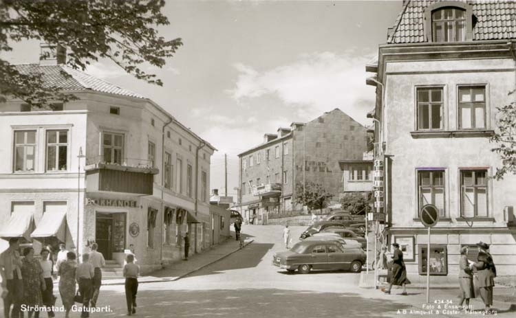 Människor på Västra Klevgatan en solig dag i Strömstad 1955.