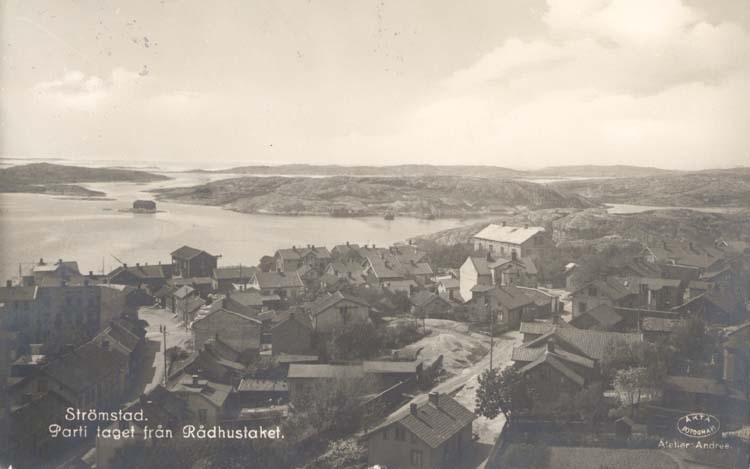 Tryckt text på kortet: "Strömstad. Parti taget från Rådhustaket."