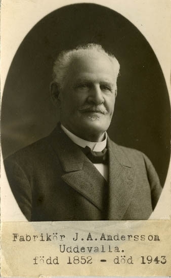 Text på kortets baksida: "Fabrikör J. A. Andersson Kålgårdsbergsgatan 12 Uddevalla. Född 1852 död 1943".