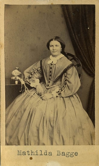Text på kortets baksida: "Mathilda Bagge, Dotter till fiskhandlare Bagge i Uddevalla. Gift med bokhandlaren Brunius".