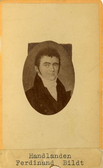 Text på kortets baksida: "Handlanden Ferdinand Bildt. Född 15/9 1781 i Myckleby. Död 10/6 1841 i Uddevalla".
