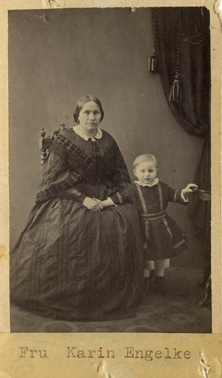 Text på kortets baksida: "Fru Karin Engelke, f. Sundberg. G M. Hans Engelke, Kodebacken. Sonen Anton.".