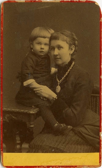 Text på kortets baksida: "Fru Ellen Essen, f. Rosenqvist m. sonen Axel".