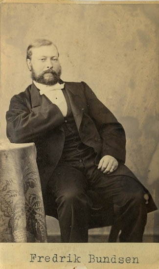 Text på kortets baksida: "Fredrik Julius Bundsen. Sista fidiekommissarien till Holma gods. f. 10/11 1833 död 23/9 1893 59 år".