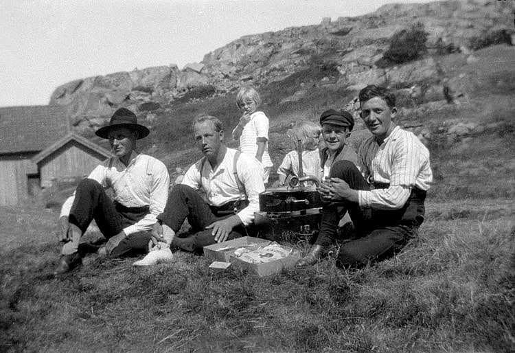Enligt senare noteringar av Erik Karlsson: "Vid Jonassons gård, Kleva. Fr.v: Hjalmar Jonasson, Torsten Kvick, Viborg Johansson, Sven Höglund".
