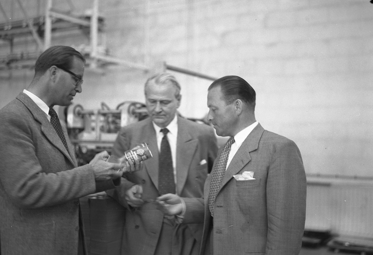 Text till bilden: "PLM. Tre personer i maskinhallen. 1951"