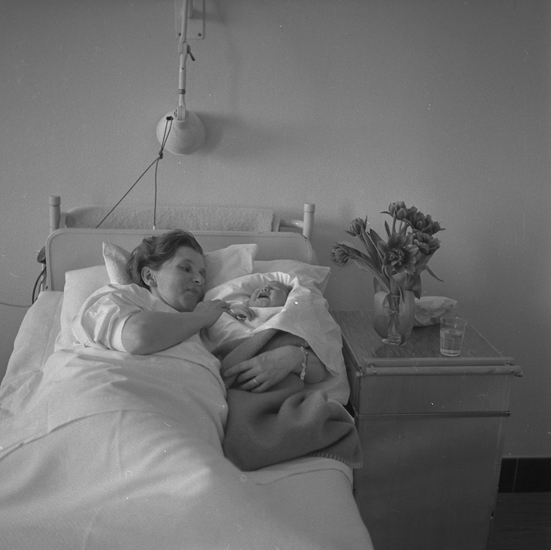 Text till bilden: "Lasarettet, Lysekil. Fru Ahlsten med baby på lasarettet. 1952.03.26"