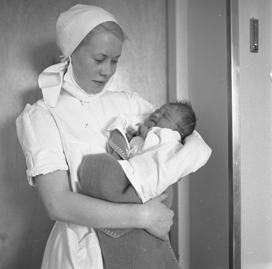 Text till bilden: "Lasarettet, Lysekil. Fru Ahlsten med baby på lasarettet. 1952.03.26"
