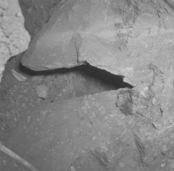 Titel: Text till bilden: "PLM. Betongpelare och golv raserade. 1955.01.28"