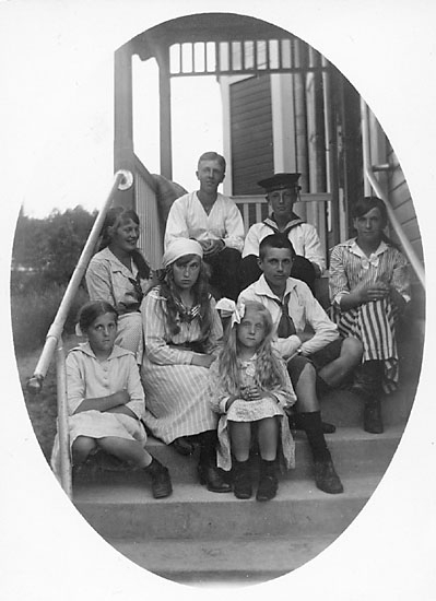 Enligt noteringar: "1917, Ina, Greta Tiberg, Maussi, Vera, Emil, Ellen, (fr.v.) Gösta Lindström och Gösta Selling."