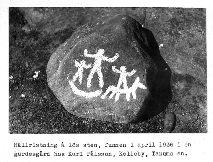 Text på kortet: "Hällristning å lös sten, funnen i april 1936 i en gärdesgård hos Karl Pålsson, Kalleby, Tanum sn".