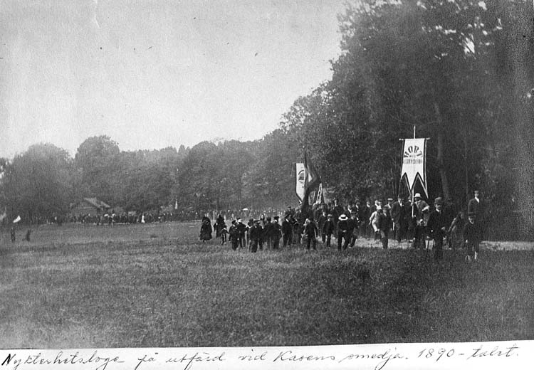 Text på kortet: "Nykterhetsloge på utfärd vid Kasens smedja. 1890-talet".