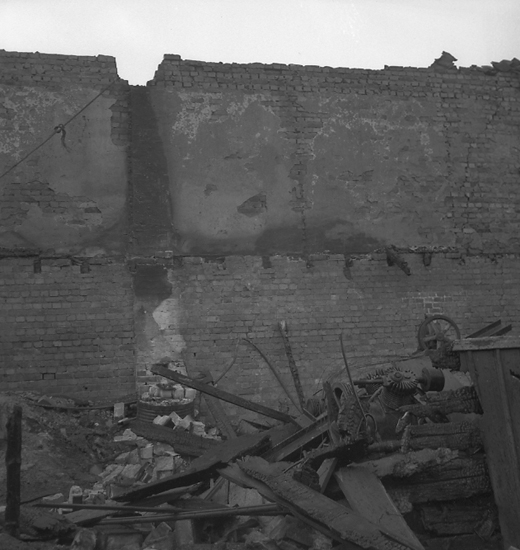 Titel: Text till bilden: "Branden i Richters fabrik. 1946.11.12".