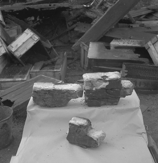 Titel: Text till bilden: "Branden i Richters fabrik. 1946.11.12".