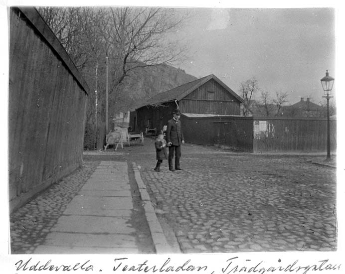 Text på kortet: "Uddevalla. Teaterladan, Trädgårdsgatan, år 1900 samma år ladan revs".