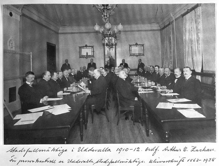 Text på kortet: "Stadsfullmäktige i Uddevalla 1910-12. Ordf. Arthur E. Zachau.