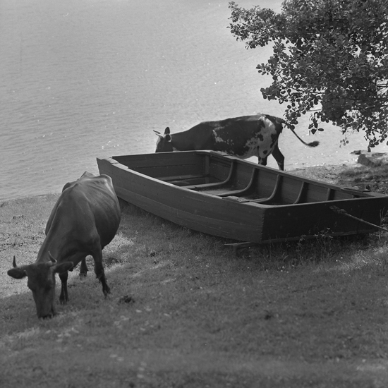 Boskapspråm uppdragen på en strand. Två kor betar i strandlinjen.