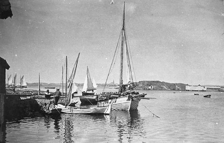 Bildtext till kopian i fotoalbumet: "Karl Johansson f. 1898, lossar ved vid Hermanssons brygga, med jakten Nordstjernan år 1929".
