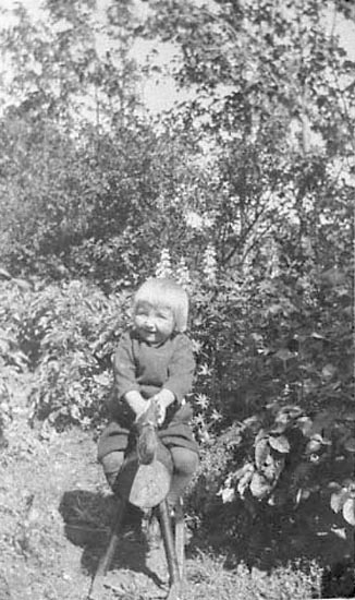 Bildtext till kopian i fotoalbumet: "Per Astor Pontusson f. 1921 på hemmagjord gunghäst.