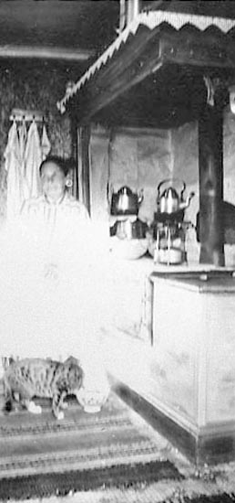 Bildtext till kopian i fotoalbumet: "Sofia Martina Henriksson f. Åller, f 1852 i sitt kök 1918".