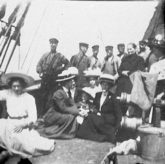 Bildtext till kopian i fotoalbumet: "Någon vacker dag före avresan till dörjet inbjöds fruar och fästmör på en segeltur".