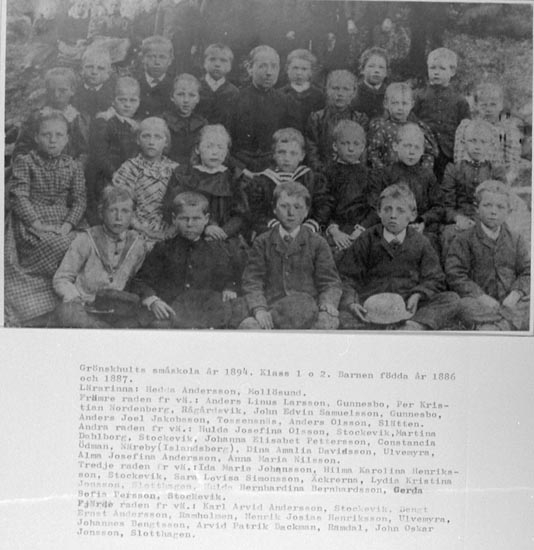 Bildtext på negativet: "Grönskhults småskola år 1894. Klass 1 & 2. Barnen födda år 1886 och 1887.