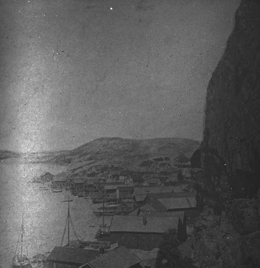 "Fjällbacka. Fjällbacka fiskeläge nere vid foten av berget, med sjöbodar och fiskebåtar."