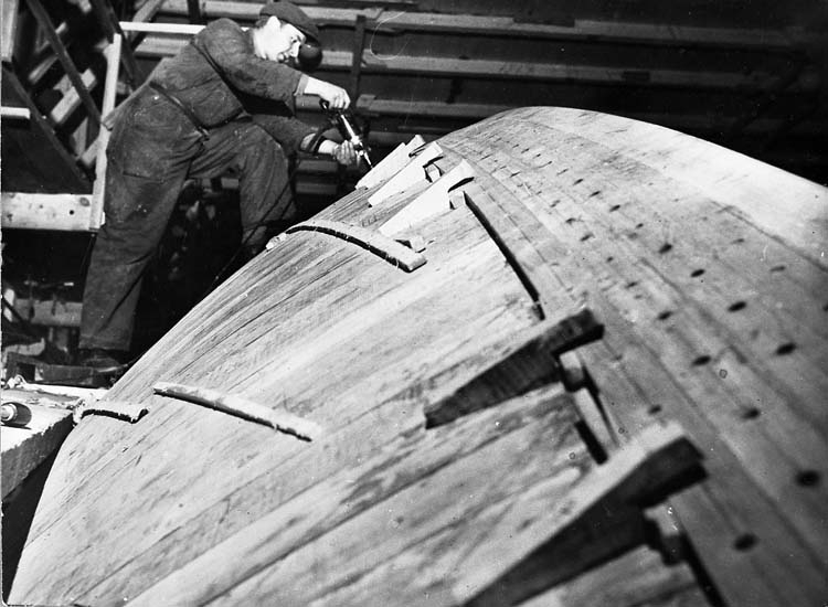 En Ljungströmbåt, "Zinganee", under byggnation vid Arendals båtvarv