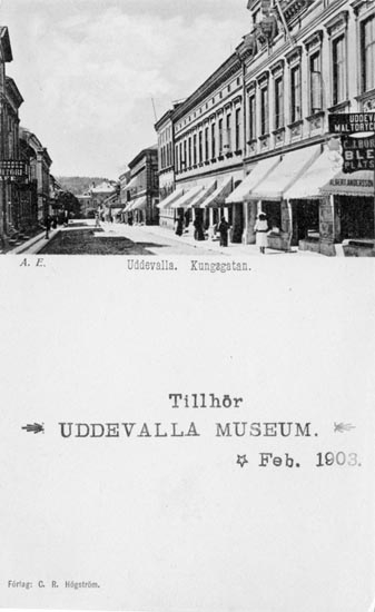 Tryckt text på vykortets framsida: "Uddevalla, Kungsgatan."