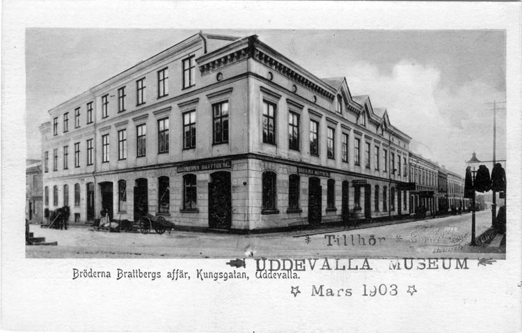 Tryckt text på vykortets framsida: "Bröderna Brattbergs affär, Kungsgatan, Uddevalla."